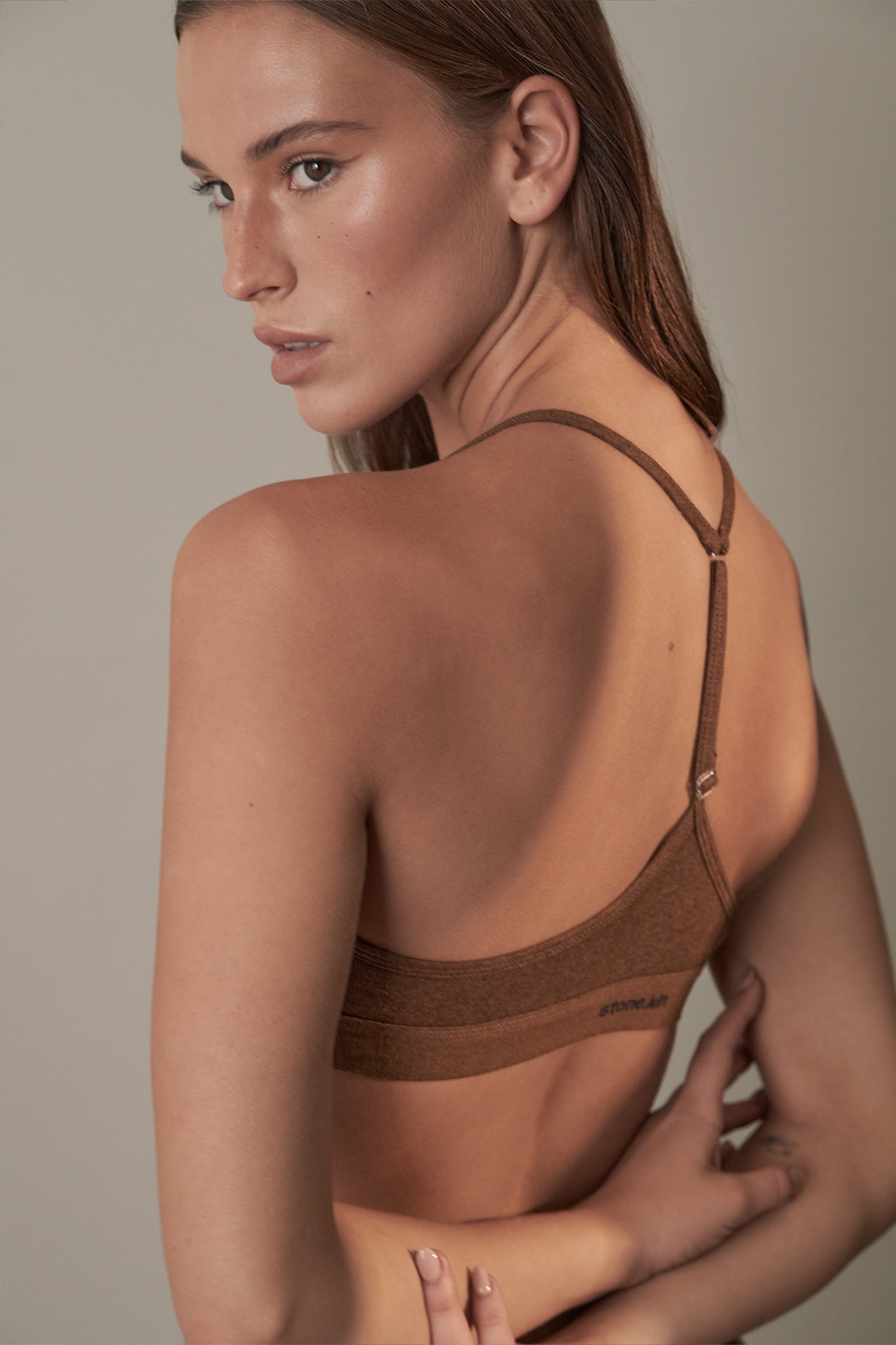 A slimline racer back bralette, made with super soft organic cotton with a hint of elastane, elevated with a rich cotton waistband and a minimal stone.kin logo.