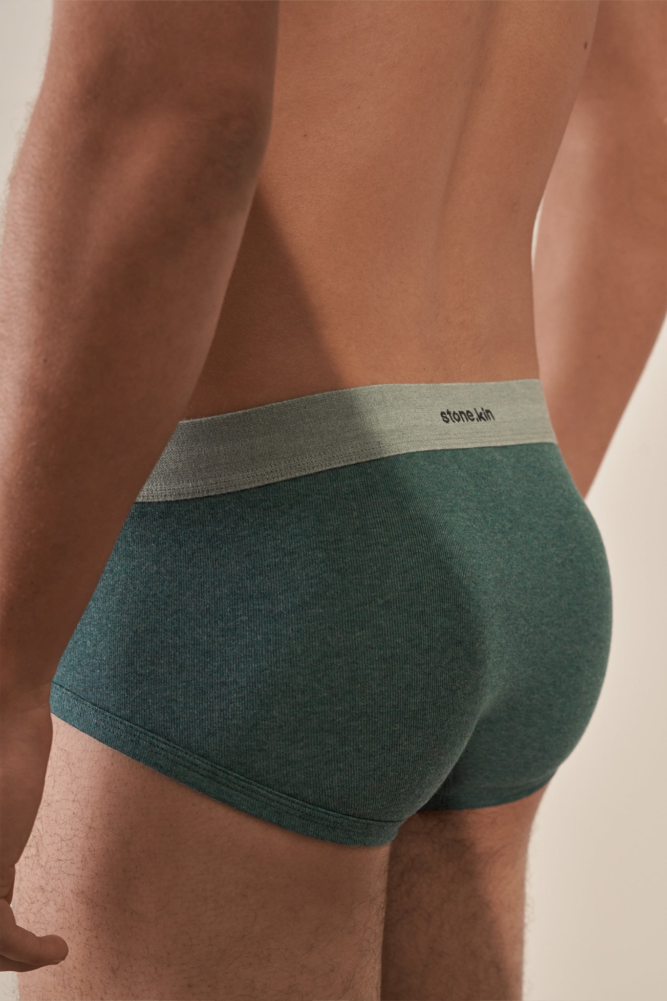 A modern european cut, made with super soft organic cotton with a hint of elastane and a cotton leg binding, elevated with a rich cotton waistband and a minimal stone.kin logo.
